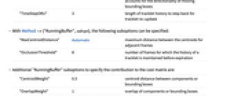 "MaxCentroidDistance" Automatic maximum distance between the centroids for adjacent frames "OcclusionThreshold" 8 number of frames for which the history of a tracklet is maintained before expiration - Additional "RunningBuffer" suboptions to specify the contribution to the cost matrix are: