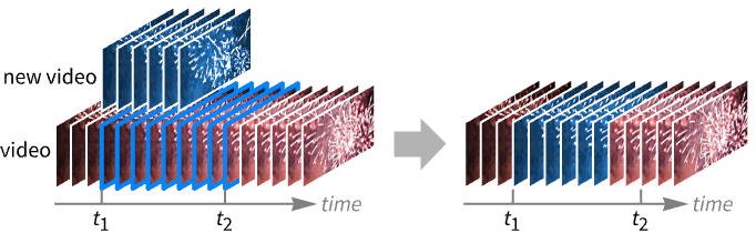 "Fill" pad or trim new to duration t2-t1 (default) "Insert" remove video from t1 to t2 and insert new at t1 - Options to control frame replacement are:
