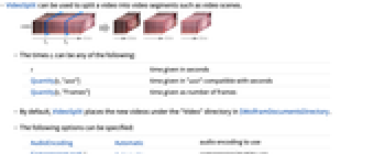 t time given in seconds Quantity[t,"unit"] time given in "unit" compatible with seconds Quantity[t,"Frames"] time given as number of frames - By default, VideoSplit places the new videos under the "Video" directory in $WolframDocumentsDirectory.