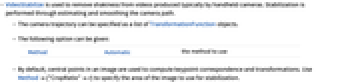 Method Automatic the method to use - By default, central points in an image are used to compute keypoint correspondence and transformations. Use Method{"CropRatio"r} to specify the area of the image to use for stabilization.