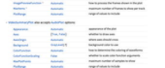 Frame Automatic whether to put a frame around the plot ImagePreviewFunction Automatic how to process the frames shown in the plot MaxItems Automatic maximum number of frames to show per track PlotRange Automatic range of values to include - VideoSummaryPlot also accepts AudioPlot options: