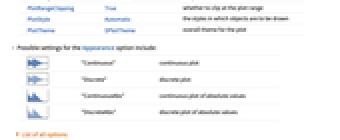 Appearance Automatic appearance of the plot Axes {True,False} whether to draw axes AxesOrigin Automatic where axes should cross Background GrayLevel[.7] background color to use ColorFunction Automatic how to determine the coloring of waveforms ColorFunctionScaling False whether to scale color function arguments MaxPlotPoints Automatic maximum number of samples to show PlotRange Automatic range of values to include PlotRangeClipping True whether to clip at the plot range PlotStyle Automatic the styles in which objects are to be drawn PlotTheme $PlotTheme overall theme for the plot - Possible settings for the Appearance option include: