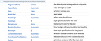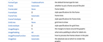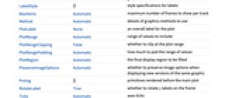 AlignmentPoint Center the default point in the graphic to align with AspectRatio Automatic ratio of height to width Axes False whether to draw axes AxesLabel None axes labels AxesOrigin Automatic where axes should cross AxesStyle {} style specifications for the axes Background None background color for the plot BaselinePosition Automatic how to align with a surrounding text baseline BaseStyle {} base style specifications for the graphic ContentSelectable Automatic whether to allow contents to be selected CoordinatesToolOptions Automatic detailed behavior of the coordinates tool Epilog {} primitives rendered after the main plot FormatType TraditionalForm the default format type for text Frame Automatic whether to put a frame around the plot FrameLabel None frame labels FrameStyle {} style specifications for the frame FrameTicks Automatic frame ticks FrameTicksStyle {} style specifications for frame ticks GridLines None grid lines to draw GridLinesStyle {} style specifications for grid lines ImageMargins 0. the margins to leave around the graphic ImagePadding All what extra padding to allow for labels etc. ImagePreviewFunction Automatic how to process the frames shown in the plot ImageSize Automatic the absolute size at which to render the graphic LabelStyle {} style specifications for labels MaxItems Automatic maximum number of frames to show per track Method Automatic details of graphics methods to use PlotLabel None an overall label for the plot PlotRange Automatic range of values to include PlotRangeClipping False whether to clip at the plot range PlotRangePadding Automatic how much to pad the range of values PlotRegion Automatic the final display region to be filled PreserveImageOptions Automatic whether to preserve image options when displaying new versions of the same graphic Prolog {} primitives rendered before the main plot RotateLabel True whether to rotate y labels on the frame Ticks Automatic axes ticks TicksStyle {} style specifications for axes ticks