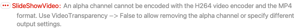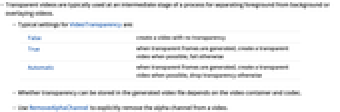 False create a video with no transparency True when transparent frames are generated, create a transparent video when possible, fail otherwise Automatic when transparent frames are generated, create a transparent video when possible, drop transparency otherwise - Whether transparency can be stored in the generated video file depends on the video container and codec.