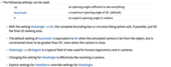 (default) θ an explicit opening angle in radians - With the setting ViewAngle->All, the complete bounding box or circumscribing sphere will, if possible, just fill the final 2D viewing area.