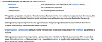 Automatic infer the projection from the value of the ViewPoint option "Perspective" use a perspective projection "Orthographic" use an orthographic projection - Perspective projection results in a foreshortening effect where the more distant an object is from the viewer, the smaller it appears. Parallel lines that point into the screen will eventually converge if extended far enough.