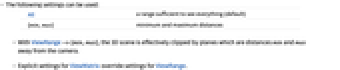 All a range sufficient to see everything (default) {min,max} minimum and maximum distances - With ViewRange->{min,max}, the 3D scene is effectively clipped by planes which are distances min and max away from the camera.