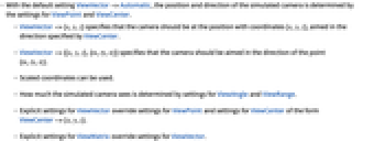 - Explicit settings for ViewVector override settings for ViewPoint and settings for ViewCenter of the form ViewCenter->{x,y,z}.