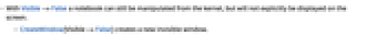 - With Visible->False a notebook can still be manipulated from the kernel, but will not explicitly be displayed on the screen.