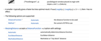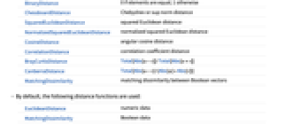 Automatic automatically determine distance function EuclideanDistance Euclidean distance ManhattanDistance Manhattan or "city block" distance BinaryDistance 0 if elements are equal; 1 otherwise ChessboardDistance Chebyshev or sup norm distance SquaredEuclideanDistance squared Euclidean distance NormalizedSquaredEuclideanDistance normalized squared Euclidean distance CosineDistance angular cosine distance CorrelationDistance correlation coefficient distance BrayCurtisDistance Total[Abs[u-v]]/Total[Abs[u+v]] CanberraDistance Total[Abs[u-v]/(Abs[u]+Abs[v])] MatchingDissimilarity matching dissimilarity between Boolean vectors - By default, the following distance functions are used: