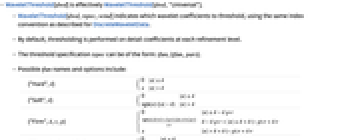 - WaveletThreshold[dwd,tspec,wind] indicates which wavelet coefficients to threshold, using the same index convention as described for DiscreteWaveletData.