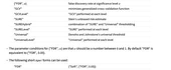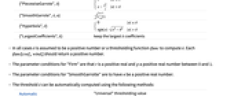 Automatic "Universal" thresholding value {"FDR",α} false discovery rate at significance level α "GCV" minimizes generalized cross-validation function "GCVLevel" "GCV" performed at each level "SURE" Stein's unbiased risk estimate "SUREHybrid" combination of "SURE" and "Universal" thresholding "SURELevel" "SURE" performed at each level "Universal" Donoho and Johnstone's universal threshold "UniversalLevel" "Universal" performed at each level - The parameter conditions for {"FDR",α} are that α should be a number between 0 and 1. By default "FDR" is equivalent to {"FDR",0.05}.