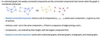 - WeaklyConnectedComponents works with undirected graphs, directed graphs, multigraphs, and mixed graphs.