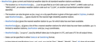 "Memberships" WMO, NCDC, and CWOP reporting network membership "NearestStation" the nearest weather station "StationDistance" distance in km between specified location and station given "StationName" weather station name - WeatherData can retrieve observational weather data from meteorological stations throughout the world.