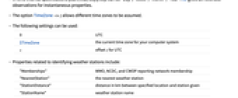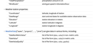"Coordinates" latitude, longitude of station "DateRange" start and end dates for available station observation data "Elevation" station elevation in meters "Latitude" station latitude in degrees "Longitude" station longitude in degrees - WeatherData["name","property",…,"form"] can give data in various forms, including: