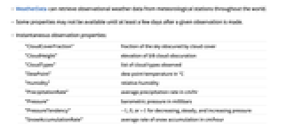 "CloudCoverFraction" fraction of the sky obscured by cloud cover "CloudHeight" elevation of 5/8 cloud obscuration "CloudTypes" list of cloud types observed "DewPoint" dew point temperature in °C "Humidity" relative humidity "PrecipitationRate" average precipitation rate in cm/hr "Pressure" barometric pressure in millibars "PressureTendency"