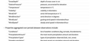 "Conditions" list of weather conditions (fog, tornado, thunderstorm) "PrecipitationAmount" the most recent precipitation amount and duration "PrecipitationTypes" types of precipitation observed (hail, rain, snow) "SnowAccumulation" the most recent accumulation amount and duration - Aggregate properties: