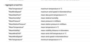 "MaxTemperature" maximum temperature in °C "MaxWindSpeed" maximum wind speed in kilometers/hour "MeanDewPoint" mean dew point temperature in °C "MeanHumidity" mean relative humidity "MeanPressure" mean pressure in millibars "MeanStationPressure" mean station pressure in millibars "MeanTemperature" mean temperature in °C "MeanVisibility" mean visibility distance in kilometers "MeanWindChill" mean wind chill temperature in °C "MeanWindSpeed" mean wind speed in kilometers/hour "MinTemperature" minimum temperature in °C "TotalPrecipitation" precipitation amount in cm "WindGusts" wind gust speed in kilometers/hour - Weather station properties:
