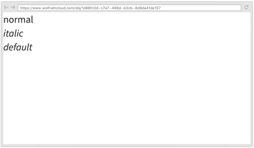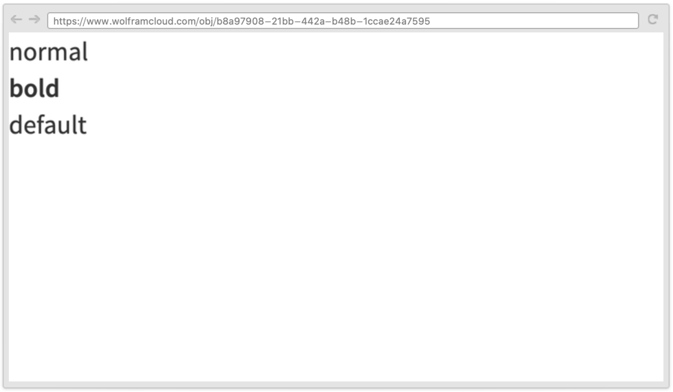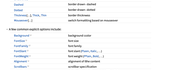 opt1val1,… explicit options "class" a named class name from the current stylesheets color directive color (Red, RGBColor[…], …) size directive a size (width, {width,height}, …) InterfaceSwitched[…] switch formatting based on the environment Scaled[…] dimension relative to window size n (any number) dimension with pixel size n Italic text italic Bold text bold Underlined text underlined Dashed border drawn dashed Dotted border drawn dotted Thickness[…],Thick,Thin border thickness Mouseover[…] switch formatting based on mouseover - A few common explicit options include: