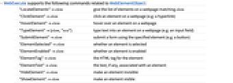 "LocateElements"elem give the list of elements on a webpage matching elem "ClickElement"elem click an element on a webpage (e.g. a hyperlink) "HoverElement"elem hover over an element on a webpage "TypeElement"{elem,"text"} type text into an element on a webpage (e.g. an input field) "SubmitElement"elem submit a form using the specified element (e.g. a button) "ElementSelected"elem whether an element is selected "ElementEnabled"elem whether an element is enabled "ElementTag"elem the HTML tag for the element "ElementText"elem the text, if any, associated with an element "HideElement"elem make an element invisible "ShowElement"elem make an element visible