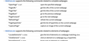 "cmd" a command without arguments "cmd" arg a command with one argument "cmd"{arg1,arg2,…} a command with multiple arguments - WebExecute supports the following commands related to complete webpages: