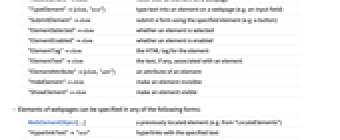 "LocateElements"elem give the list of elements on a webpage matching elem "ClickElement"elem click an element on a webpage (e.g. a hyperlink) "HoverElement"elem hover over an element on a webpage "TypeElement"{elem,"text"} type text into an element on a webpage (e.g. an input field) "SubmitElement"elem submit a form using the specified element (e.g. a button) "ElementSelected"elem whether an element is selected "ElementEnabled"elem whether an element is enabled "ElementTag"elem the HTML tag for the element "ElementText"elem the text, if any, associated with an element "ElementAttribute"{elem,"attr"} an attribute of an element "HideElement"elem make an element invisible "ShowElement"elem make an element visible - Elements of webpages can be specified in any of the following forms: