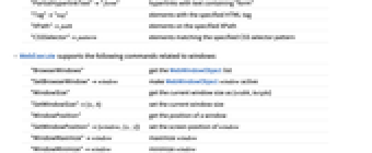 WebElementObject[...] a previously located element (e.g. from "LocateElements") "HyperlinkText" "text" hyperlinks with the specified text "PartialHyperlinkText""form" hyperlinks with text containing "form" "Tag""tag" elements with the specified HTML tag "XPath"path elements on the specified XPath "CSSSelector"pattern elements matching the specified CSS selector pattern - WebExecute supports the following commands related to windows: