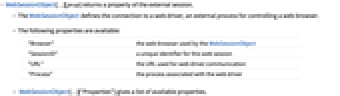 "Browser" the web browser used by the WebSessionObject "SessionID" a unique identifier for this web session "URL" the URL used for web driver communication "Process" the process associated with the web driver - WebSessionObject[…]["Properties"] gives a list of available properties.