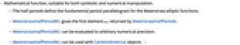 - WeierstrassHalfPeriodW1 gives the first element ω1 returned by WeierstrassHalfPeriods.