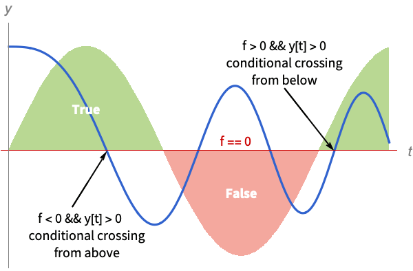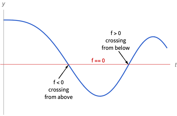 f0 the function f of the solution variables crosses zero f>0 f crosses zero from below f<0 f crosses zero from above Mod[t,