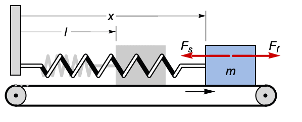 Model a block on a moving conveyor belt anchored to a wall by a spring using different models for the friction force