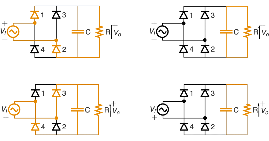 Model an AC-to-DC full wave rectifier with four diodes and a capacitor for smoothing the output: