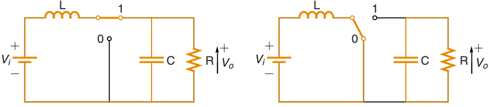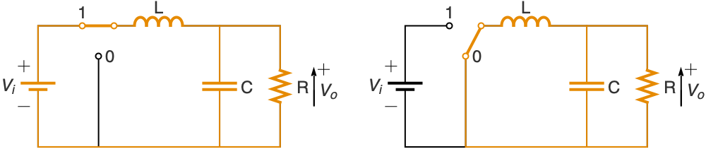 Model a DC-to-DC buck-boost converter from input voltage level vi to desired output voltage level vo using a pulse-width modulated feedback control q[t]: