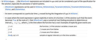 crossed during the integration of eqns in NDSolve. - In cases where the event expression is given explicitly in terms of a function f of the solution such that the event becomes True at the roots of f, then WhenEvent uses a numerical root-finding procedure to determine an interval