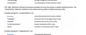 "DetectionMethod" Automatic the method to use for detecting an event "LocationMethod" Automatic the method to use for locating an event within a time step "IntegrateEvent" Automatic whether to integrate the event function "Priority" Automatic priority for actions of simultaneous events - Possible settings for "DetectionMethod" are: