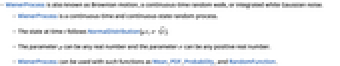 - WienerProcess can be used with such functions as Mean, PDF, Probability, and RandomFunction.