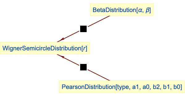 - WignerSemicircleDistribution is related to a number of other distributions. It is generalized by PearsonDistribution, in the sense that the PDF of WignerSemicircleDistribution[r] is precisely the same as that of PearsonDistribution[1,1,0,-1,0,r] for r>0. Similarly, WignerSemicircleDistribution can be realized as a transformation (TransformedDistribution) of BetaDistribution, while PDF[WignerSemicircleDistribution[r],x] tends to DiracDelta[x] as r→0. WignerSemicircleDistribution is also related to VonMisesDistribution and BetaPrimeDistribution.