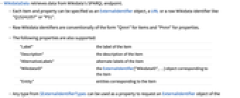 "Label" the label of the item "Description" the description of the item "AlternativeLabels" alternate labels of the item "WikidataID" the ExternalIdentifier["WikidataID",…] object corresponding to the item "Entity" entities corresponding to the item - Any type from $ExternalIdentifierTypes can be used as a property to request an ExternalIdentifier object of the specified type.