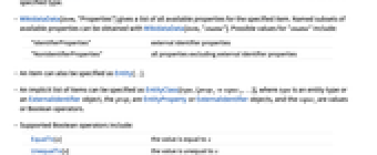 - An implicit list of items can be specified as EntityClass[type,{prop1vspec1,…}], where type is an entity type or an ExternalIdentifier object, the propi are EntityProperty or ExternalIdentifier objects, and the vspeci are values or Boolean operators.