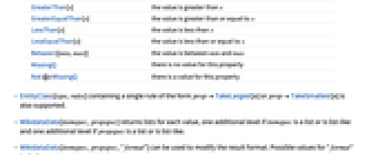 EqualTo[x] the value is equal to x UnequalTo[x] the value is unequal to x GreaterThan[x] the value is greater than x GreaterEqualThan[x] the value is greater than or equal to x LessThan[x] the value is less than x LessEqualThan[x] the value is less than or equal to x Between[{min,max}] the value is between min and max MissingQ there is no value for this property Not@*MissingQ there is a value for this property - EntityClass[type,rules] containing a single rule of the form propTakeLargest[n] or propTakeSmallest[n] is also supported.