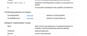 "Value" the value (default) "Association" an association including the value, qualifiers and references "Dataset" a Dataset including the value, qualifiers and references {"format","opt1"val1,…} suboptions controlling what to include in an association or a dataset All an association including the value, qualifiers and references - The following suboptions can be given: