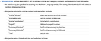 "ArticlePlaintext" plain text version of article content "ArticleWikicode" article content in Wikicode "ArticleContributors" list of article contributors "PageID" Wikipedia page ID number "SummaryPlaintext" brief article summary in plain text "SummaryWikicode" brief article summary in Wikicode "Title" article title - Properties about linked articles and websites include: