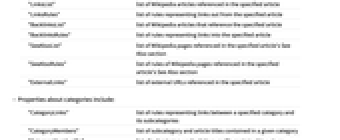 "LinksList" list of Wikipedia articles referenced in the specified article "LinksRules" list of rules representing links out from the specified article "BacklinksList" list of Wikipedia articles that reference the specified article "BacklinksRules" list of rules representing links into the specified article "SeeAlsoList" list of Wikipedia pages referenced in the specified article's See Also section "SeeAlsoRules" list of rules of Wikipedia pages referenced in the specified article's See Also section "ExternalLinks" list of external URLs referenced in the specified article - Properties about categories include: