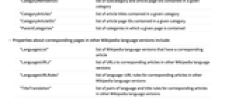 "CategoryLinks" list of rules representing links between a specified category and its subcategories "CategoryMembers" list of subcategory and article titles contained in a given category "CategoryMemberIDs" list of subcategory and article page IDs contained in a given category "CategoryArticles" list of article titles contained in a given category "CategoryArticleIDs" list of article page IDs contained in a given category "ParentCategories" list of categories in which a given page is contained - Properties about corresponding pages in other Wikipedia language versions include: