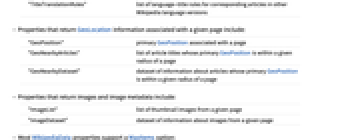"GeoPosition" primary GeoPosition associated with a page "GeoNearbyArticles" list of article titles whose primary GeoPosition is within a given radius of a page "GeoNearbyDataset" dataset of information about articles whose primary GeoPosition is within a given radius of a page - Properties that return images and image metadata include: