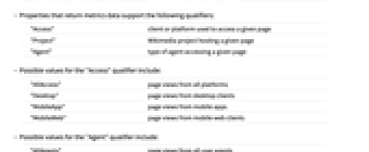 "Access" client or platform used to access a given page "Project" Wikimedia project hosting a given page "Agent" type of agent accessing a given page - Possible values for the "Access" qualifier include: