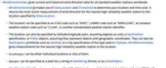 "Coordinates" weather station coordinates as a GeoPosition "Memberships" WMO, NCDC, and CWOP reporting network membership "NearestStation" the nearest weather station "StationDistance" distance in km between specified location and station given "StationName" weather station name - WindDirectionData can retrieve observational wind direction data from meteorological stations throughout the world.