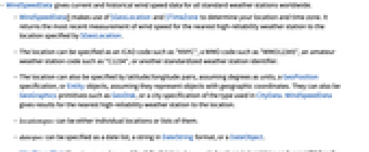 - WindSpeedData[locationspec,datespec,func] is used to specify the format of output when locations are specified.