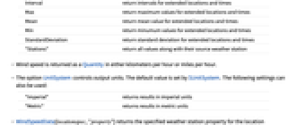 All return all values for extended locations and times Automatic return intervals for extended locations and indeterminate times Interval return intervals for extended locations and times Max return maximum values for extended locations and times Mean return mean value for extended locations and times Min return minumum values for extended locations and times StandardDeviation return standard deviation for extended locations and times "Stations" return all values along with their source weather station - Wind speed is returned as a Quantity in either kilometers per hour or miles per hour.