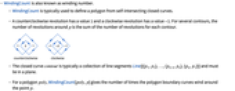- For a polygon poly, WindingCount[poly,p] gives the number of times the polygon boundary curves wind around the point p.
